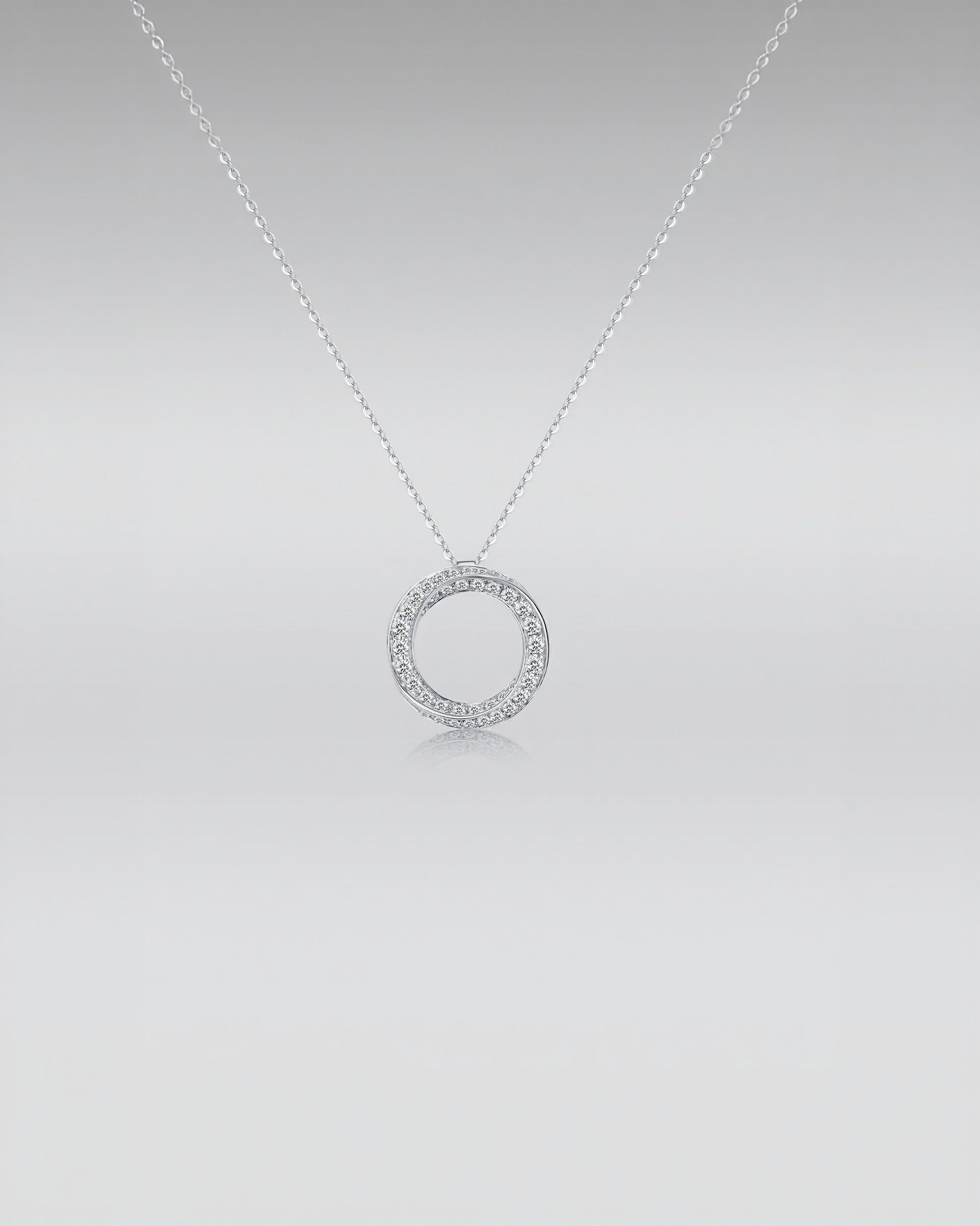 This elegant necklace is crafted from solid 18k white gold and features a delicate circular pendant adorned with brilliant lab-grown diamonds. The open circle symbolizes unity and eternity, making it a timeless piece that adds effortless sophistication to any outfit. Ethically sourced and sustainably crafted, this necklace is perfect for both everyday elegance and special occasions.