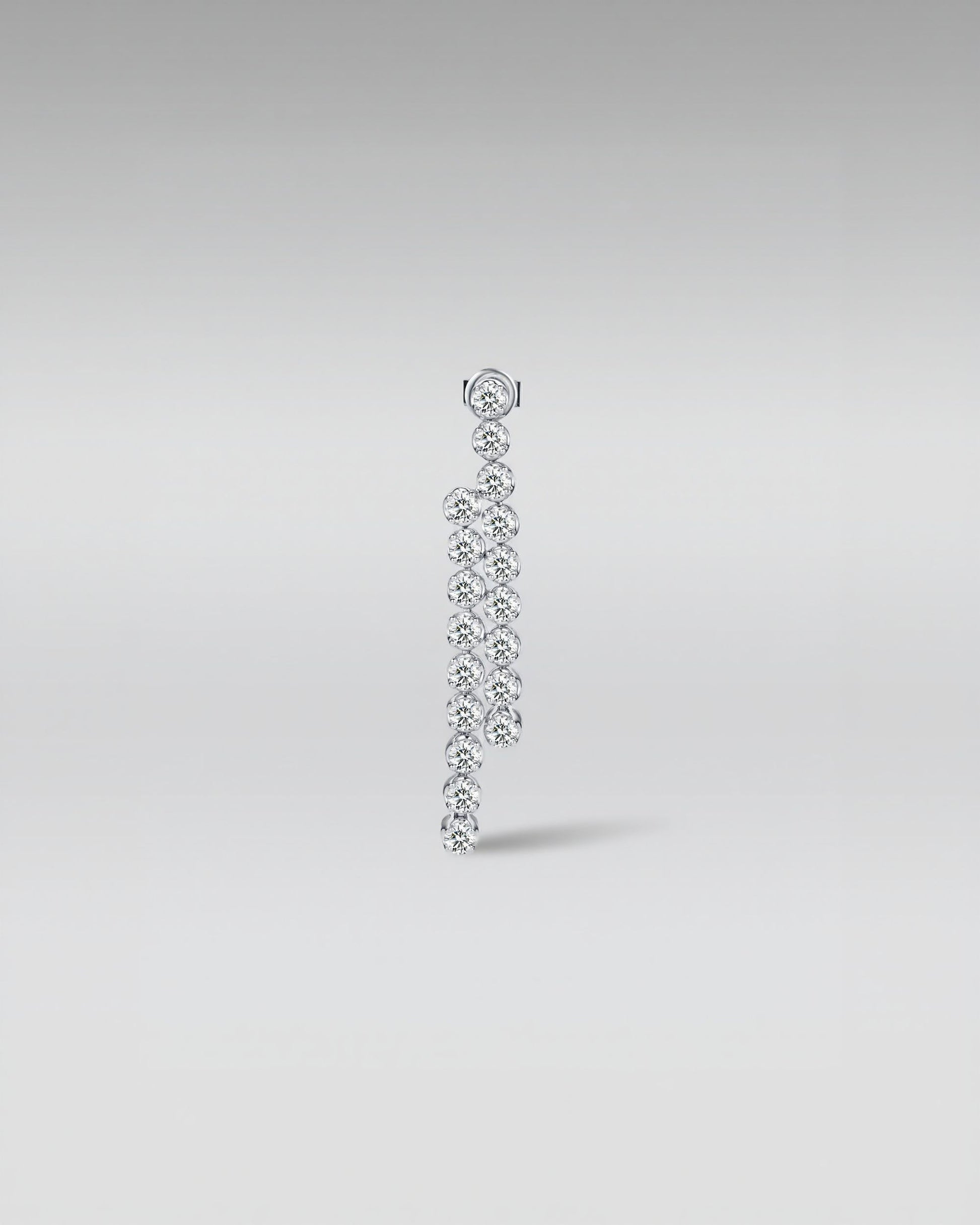 These stunning drop earrings are crafted from solid 18k white gold and set with a cascading line of brilliant lab-grown diamonds. Their elegant, flowing silhouette creates a graceful movement and radiant sparkle with every step. Ethically sourced and sustainably crafted, they are the perfect statement for evening wear, weddings, or special occasions.