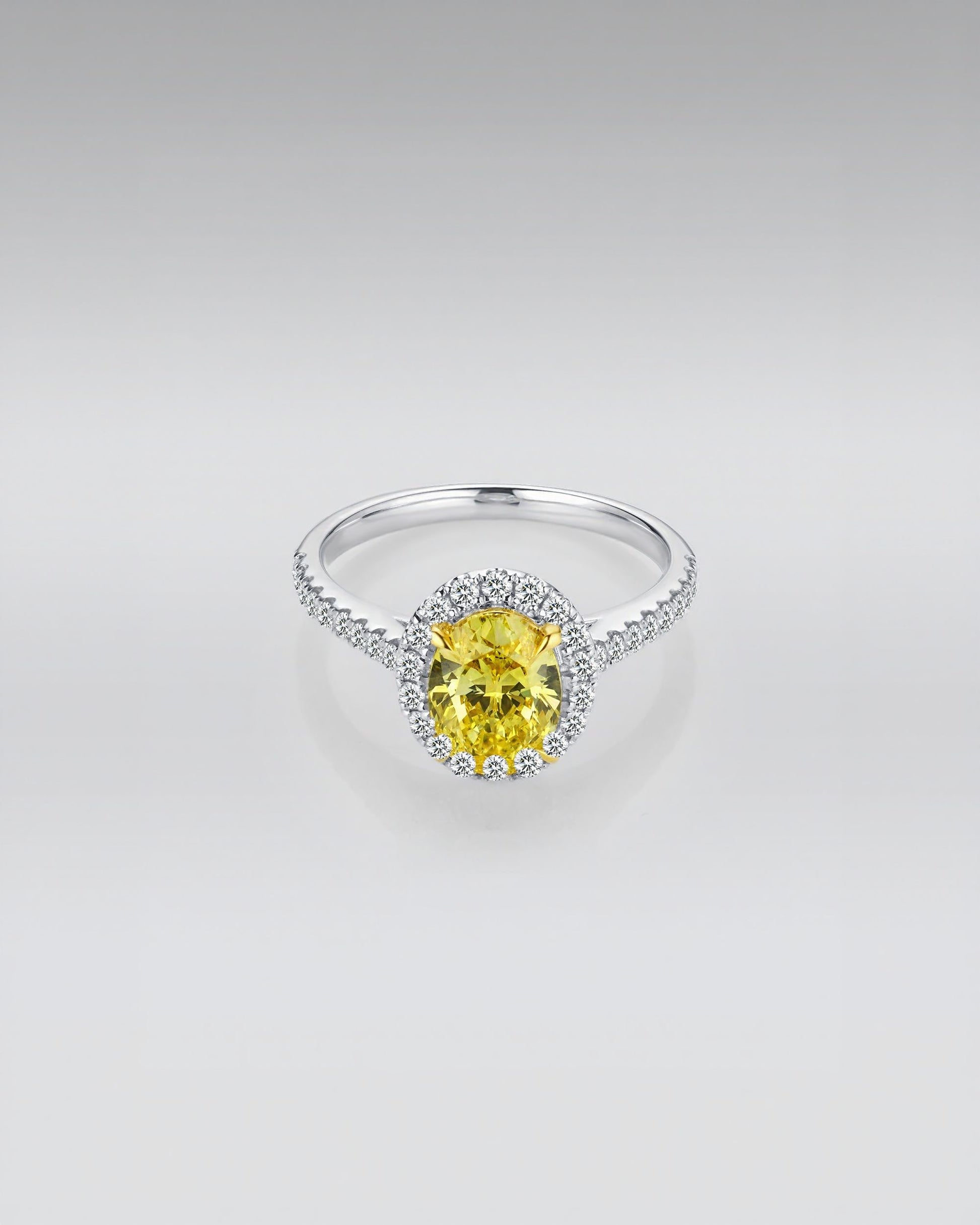 This exquisite halo engagement ring is crafted from solid 18k white gold and features a radiant yellow oval-cut lab-grown diamond at its center. The brilliant yellow stone is gracefully framed by a halo of sparkling white diamonds, amplifying its vibrant hue and fire. The pavé-set band adds a refined touch of brilliance, making this ring a true statement of modern elegance.