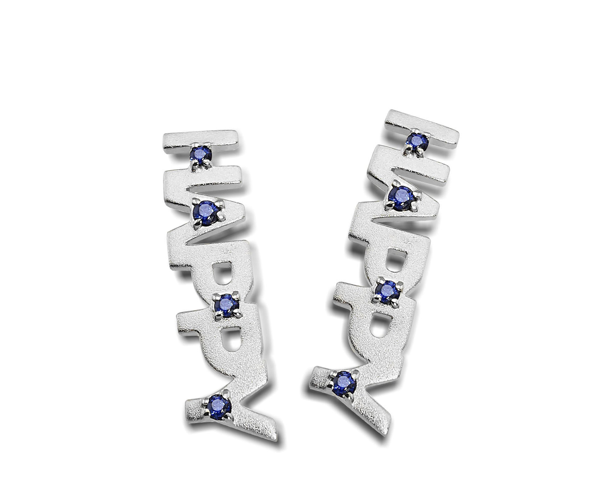 Unique Design: The "Happy" earrings feature a modern, stylized design with the word "HAPPY" spelled out in elegant letters. Each letter is meticulously crafted and embellished with a small blue gemstone, adding a subtle yet striking touch of color. The matte finish of the letters contrasts beautifully with the sparkling stones, giving the earrings depth and texture.