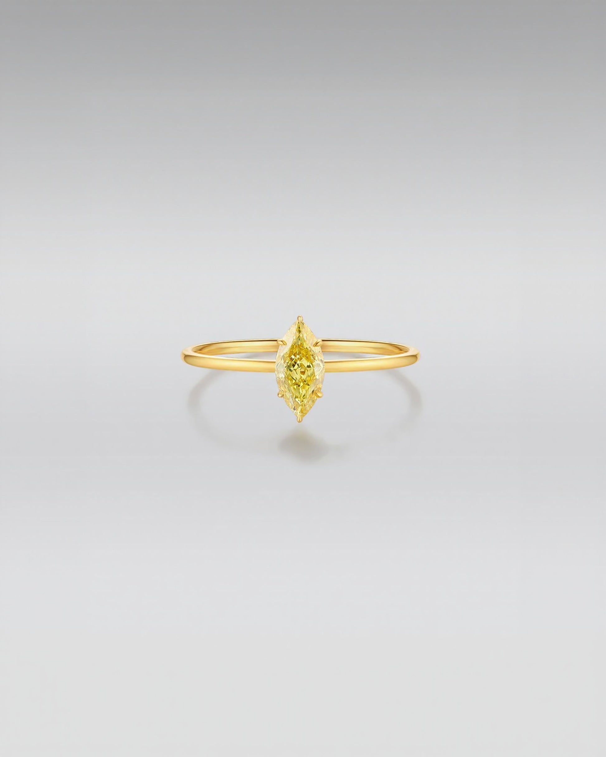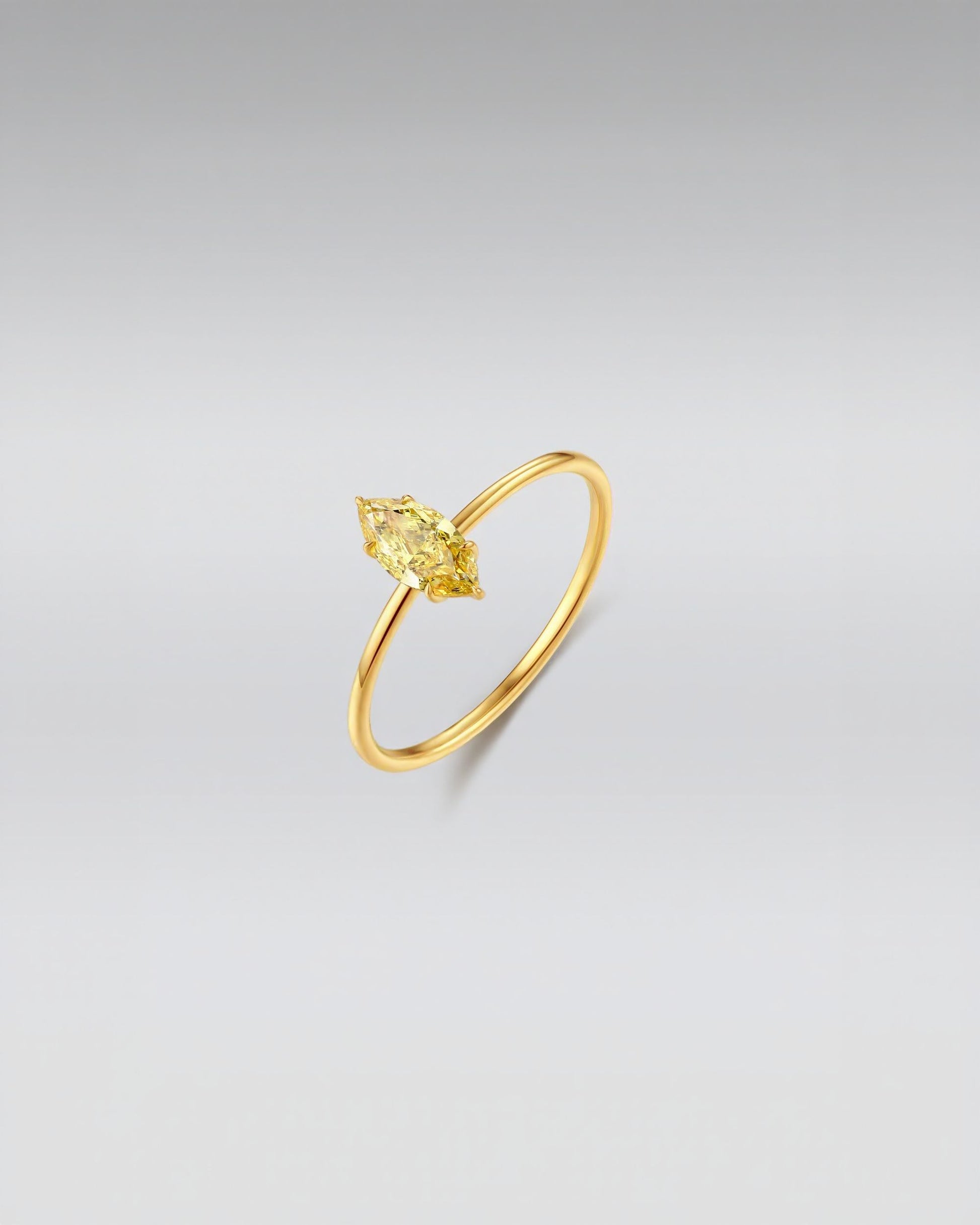 Vibrant and Sleek Design: This exquisite ring showcases a brilliant marquise-cut yellow diamond set in luxurious 18K gold. The vibrant pop of color and sleek, minimalist design make this piece both eye-catching and elegant, perfect for someone seeking a distinctive look.